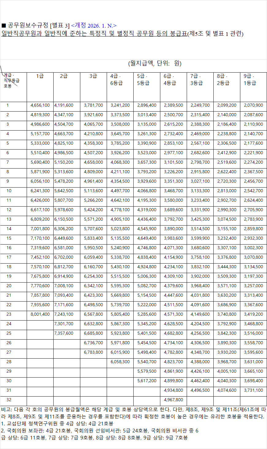 2026년 일반직 공무원 봉급표 예상