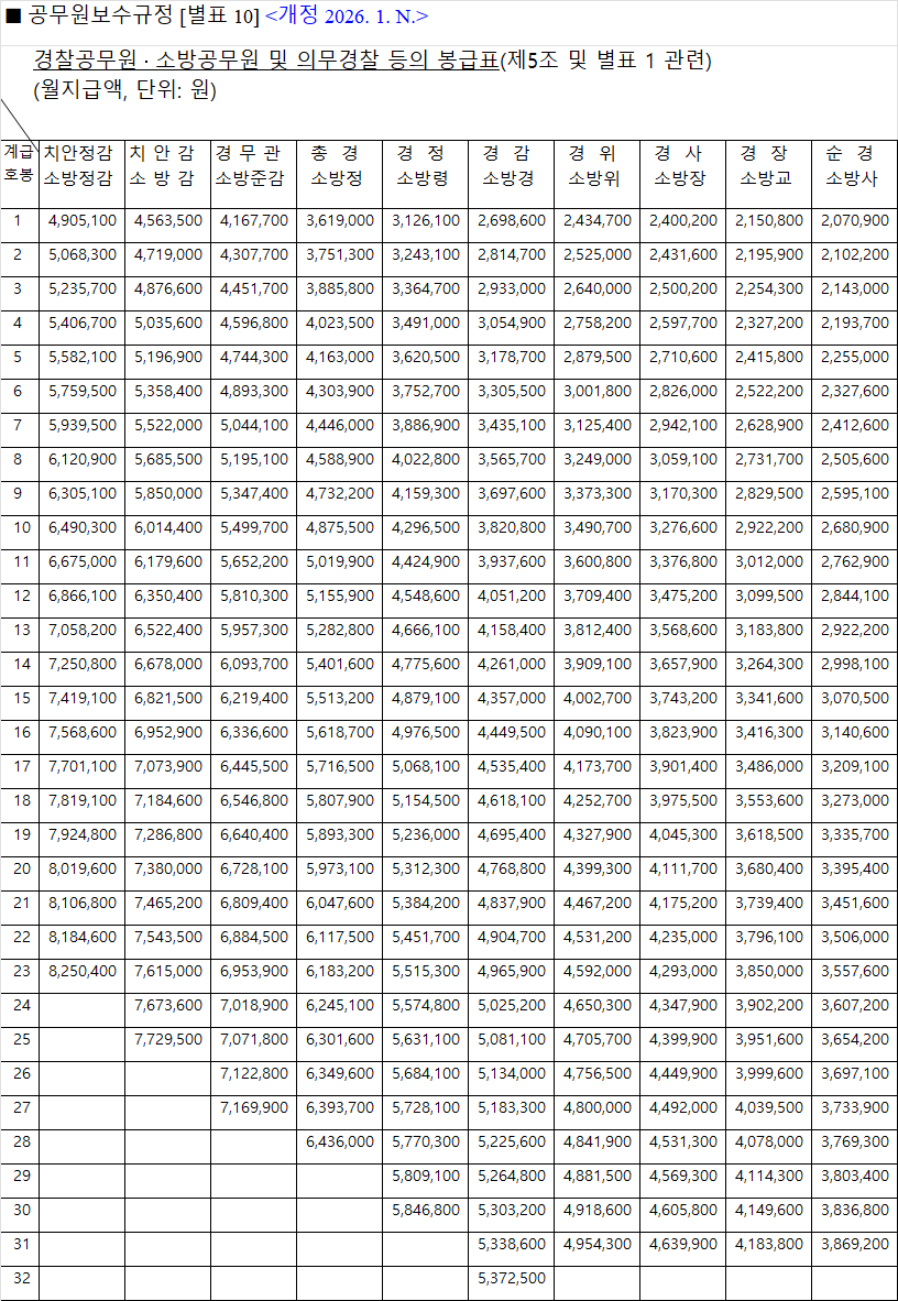 경찰과 소방공무원 역시 2026년 봉급표에서 전 계급 동일하게 3.5% 인상률이 적용됩니다. 대표적인 예시는 다음과 같습니다.